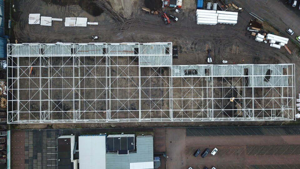 De staalconstructie is volledig gemonteerd en daarmee is een belangrijke mijlpaal behaald. Op naar de volgende stap!
